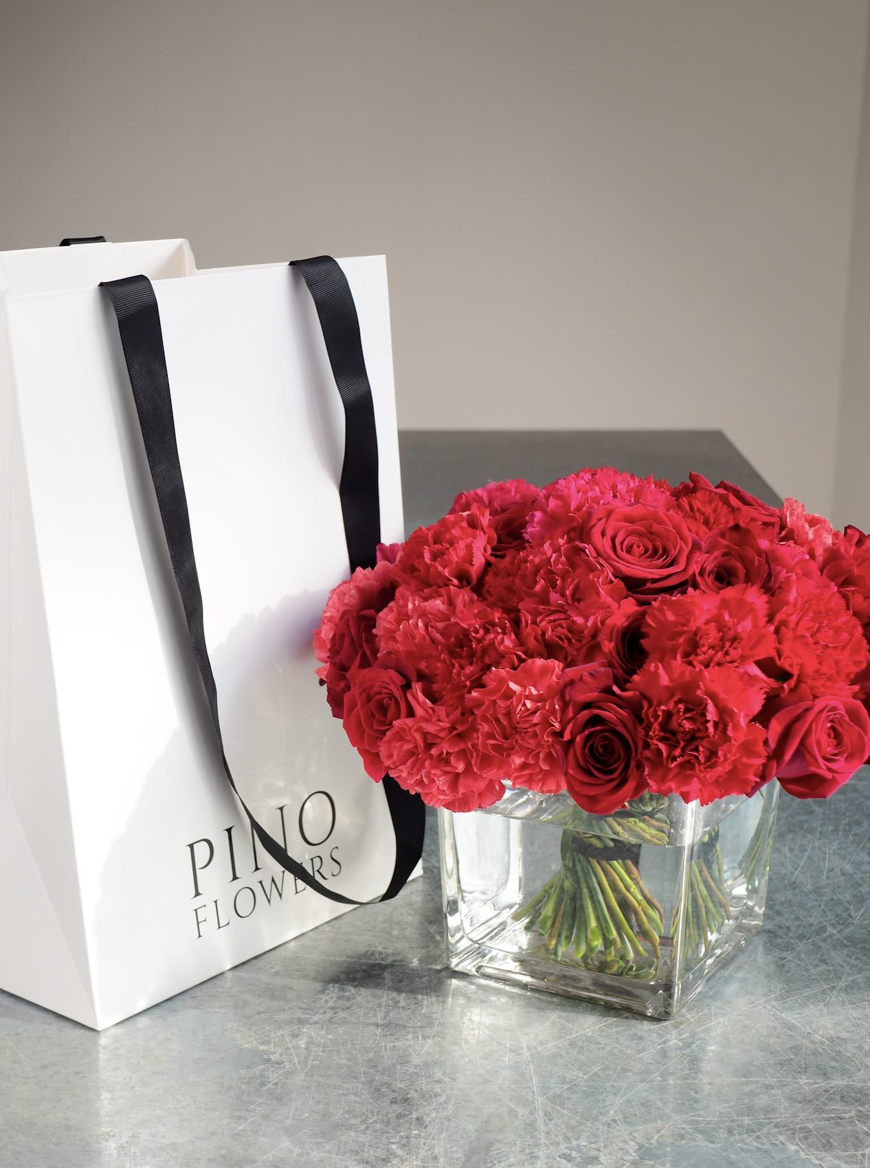 Red bouquet of roses and carnations. Vase included.